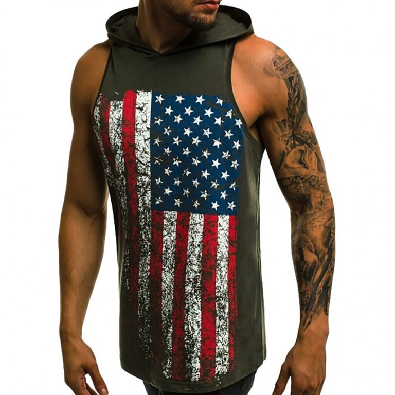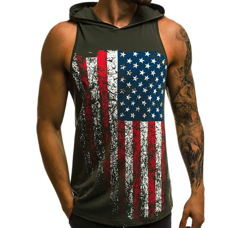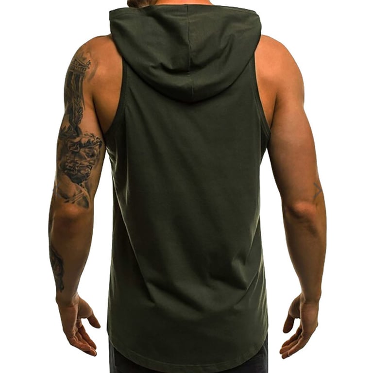 Men's sleeveless t-shirt. Hooded neckline. Loose comfortable fit with a colourful print on the front. Available in multiple variants.
