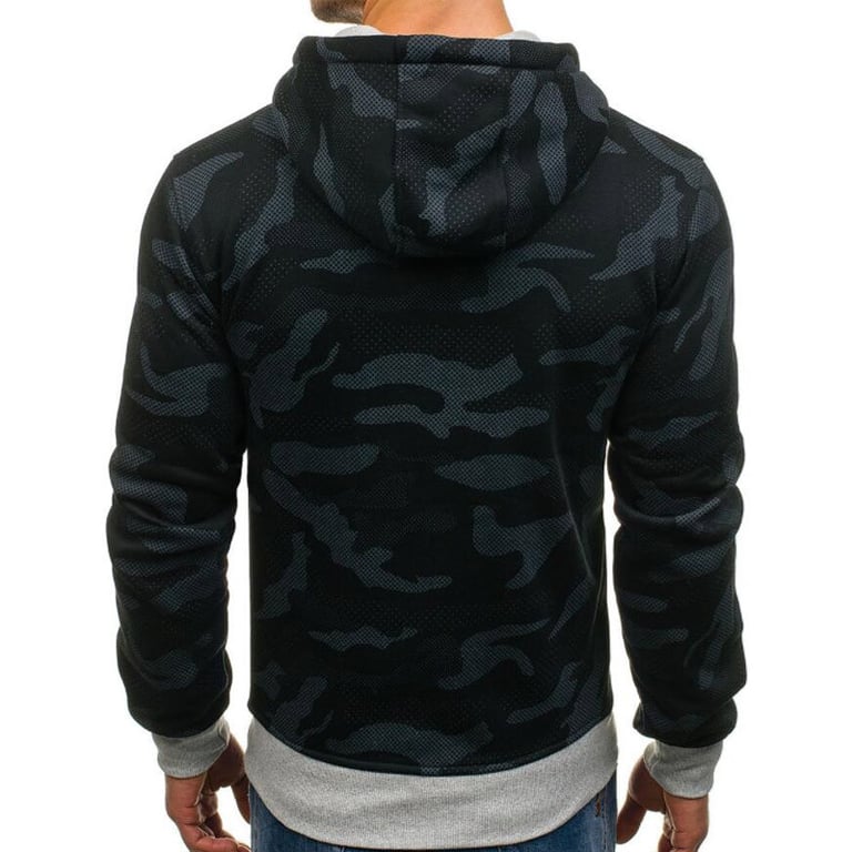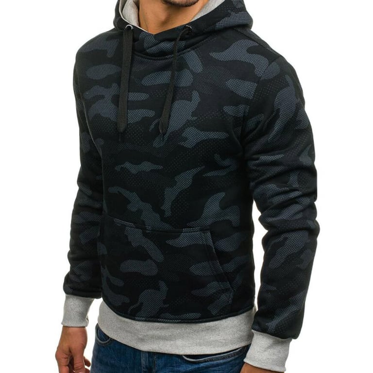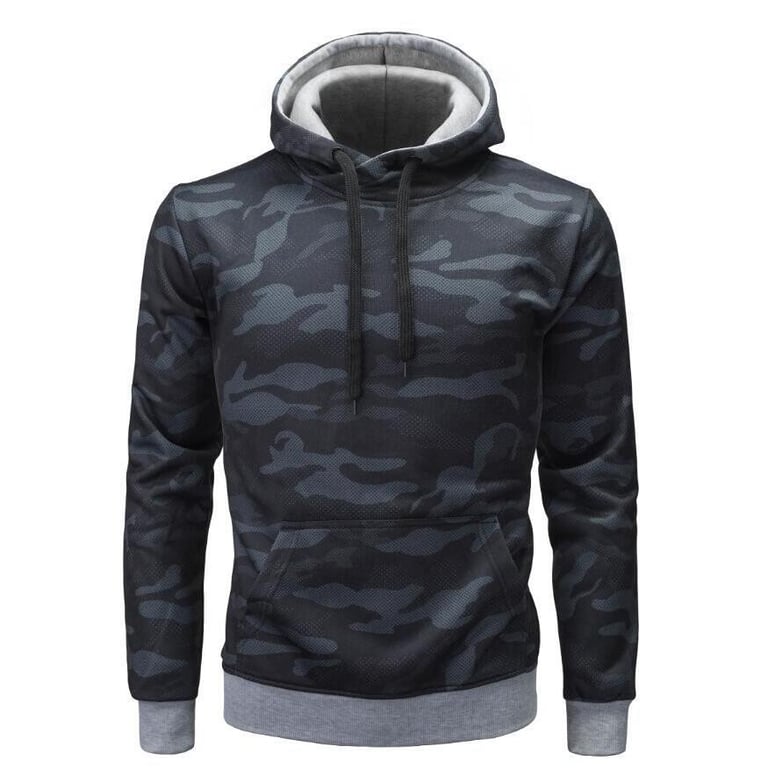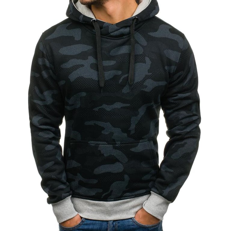 Men's pullover hoodie. Hood with drawstrings for tightening. Kangaroo pocket. Camouflage pattern. Available in two colour variants.