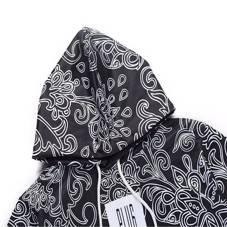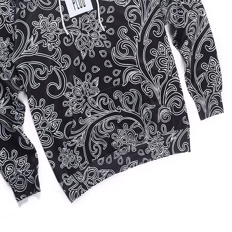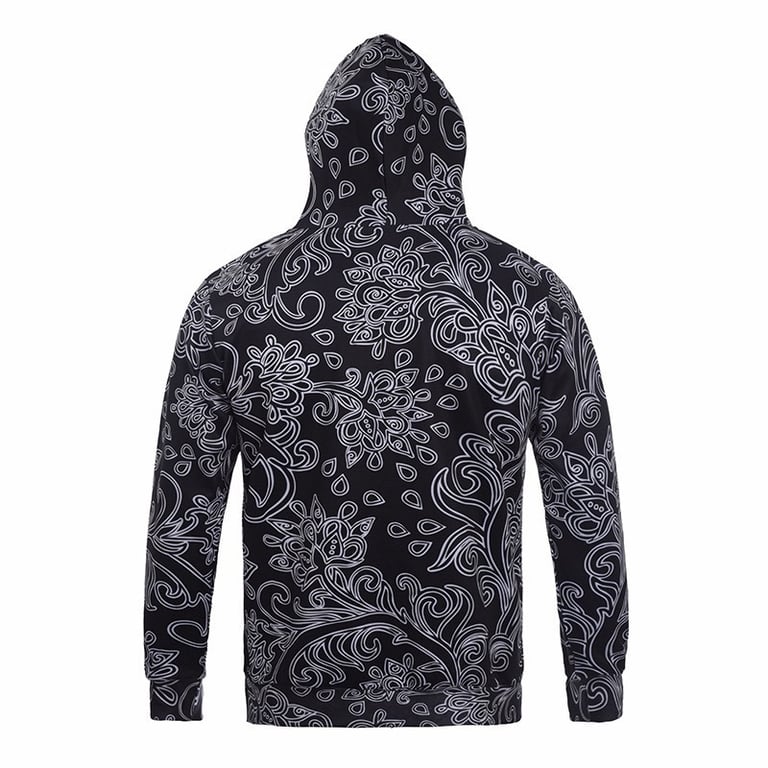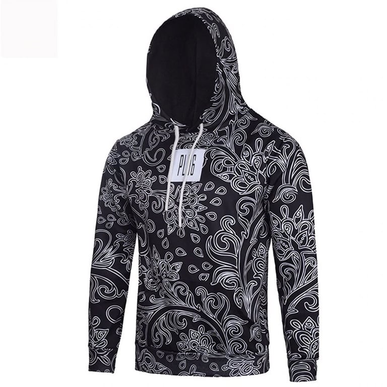 Men's pullover hoodie. Hood with drawstrings for tightening. Loose fit, comfortable material. Kangaroo pocket. Patterned print and text on the front.