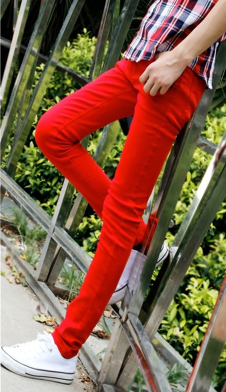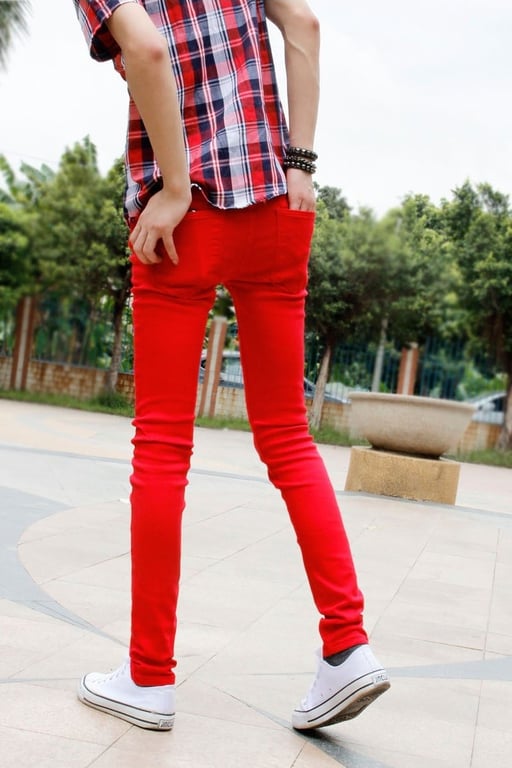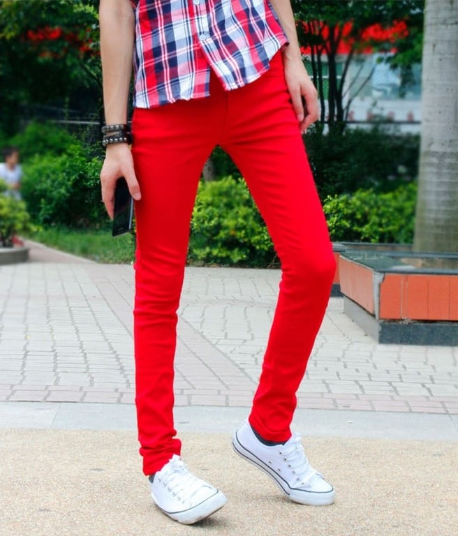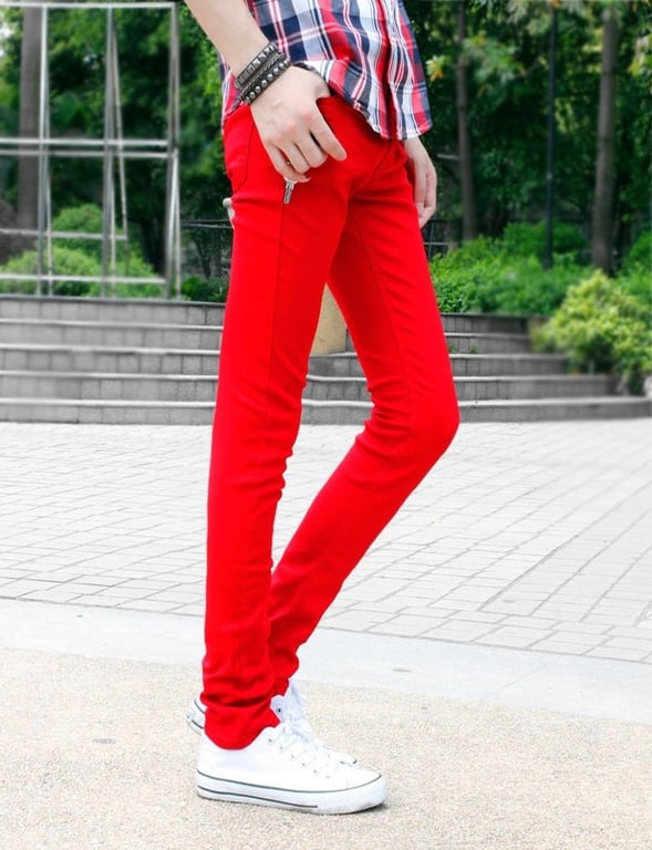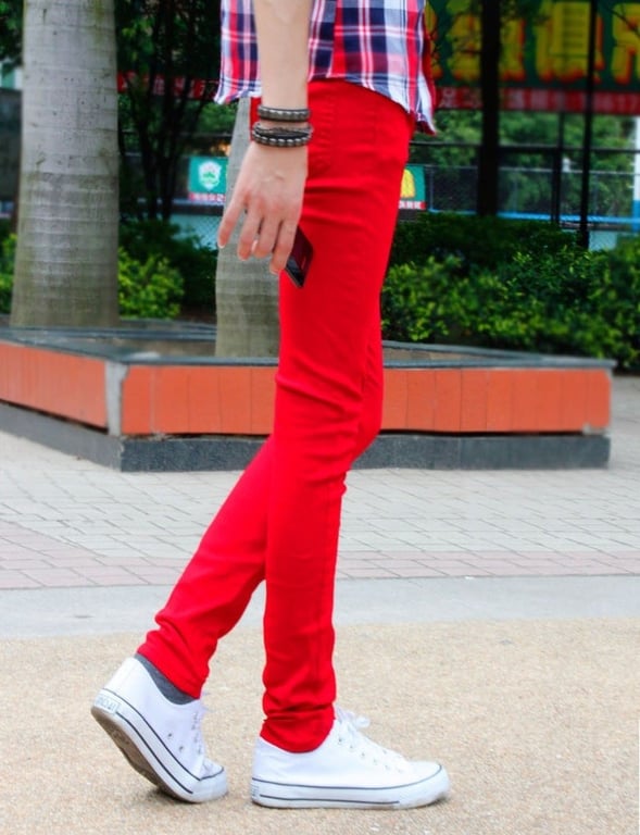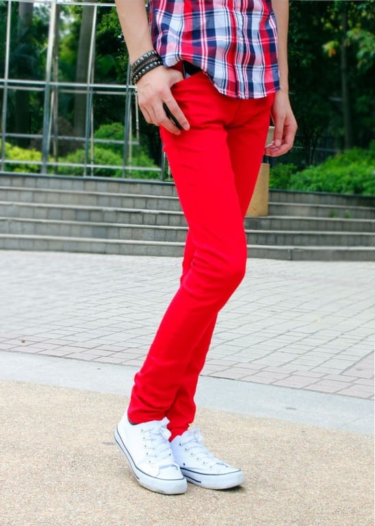 In this case, it’s better to choose a more neutral top, as the red jeans will become the focal point of the outfit, attracting attention, and with too bold a t-shirt or shirt, the look could appear overdone.