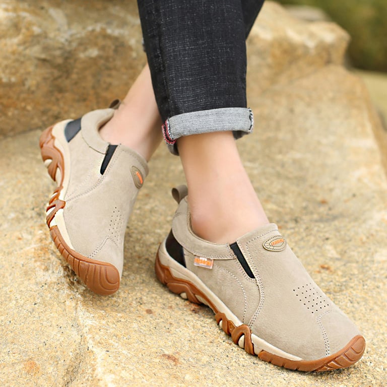 Men's slip-on shoes with a round sturdy toe. Rubber non-slip sole with a tread pattern. Synthetic leather. Available in multiple variants.