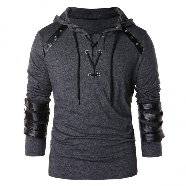 Men's long-sleeve T-shirt with a hood. The T-shirt features a V-neck with lacing and faux leather details. Available in multiple colour options.
