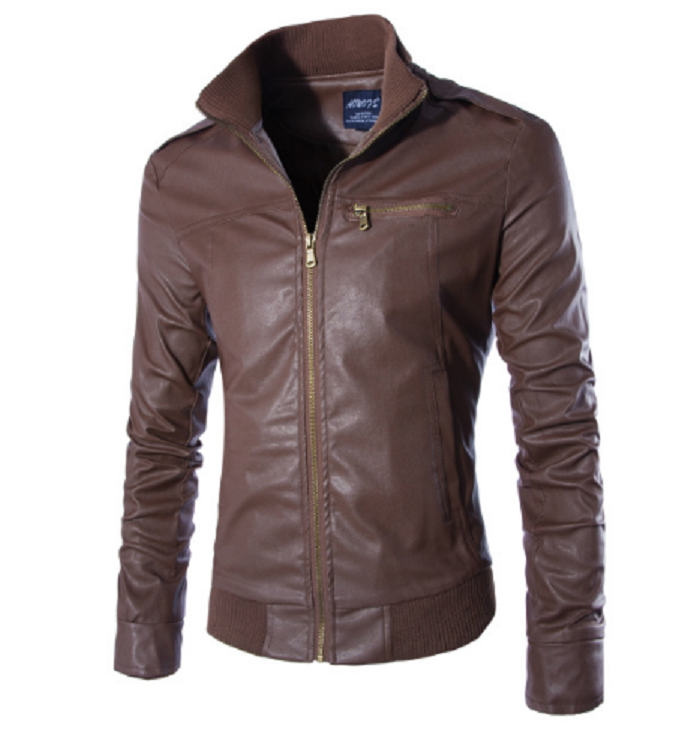 Dress in this stylish leather jacket with a collar.