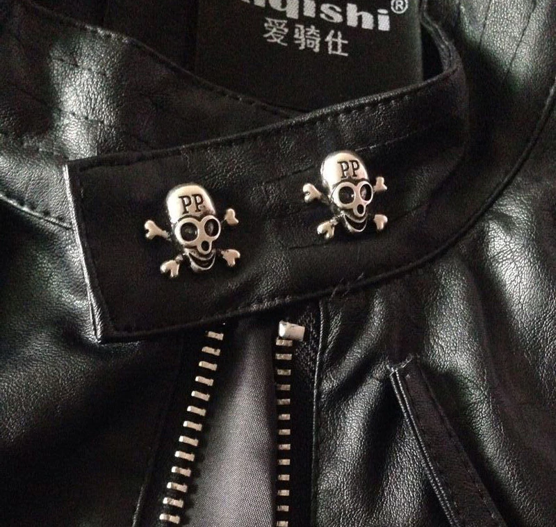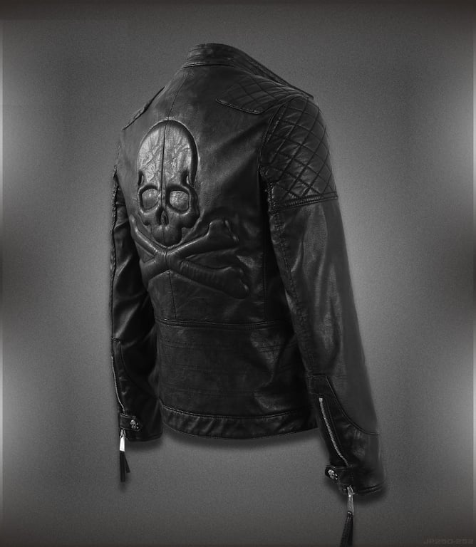 The jacket is leather and features a giant skull on the back.