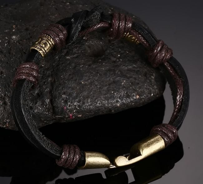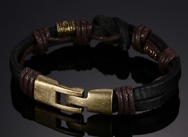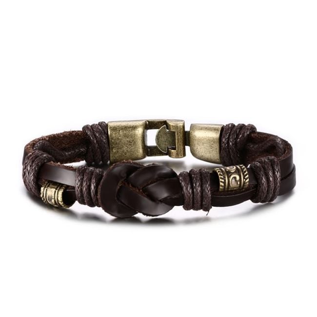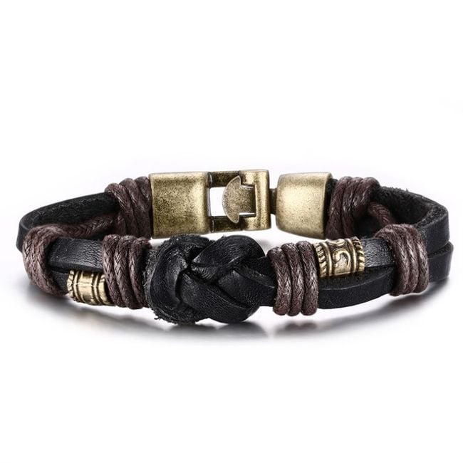 The faux leather bracelet with a knot is adorned with metal beads.