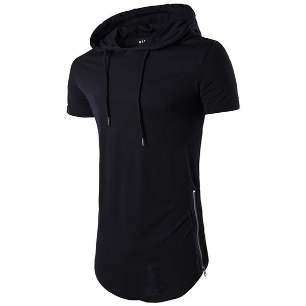Men's short-sleeve hoodie with drawstrings. The shirt has an extended cut and a decorative zip on the side. Available in multiple colour options.