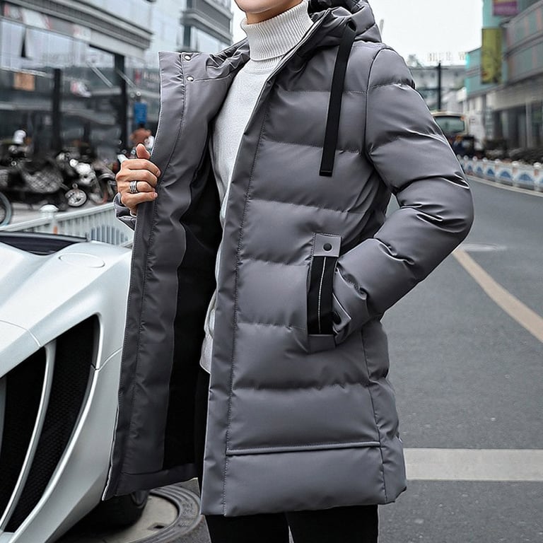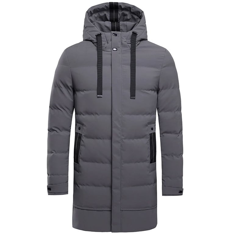 Men's winter padded jacket. The jacket features a zip fastening, an adjustable hood with drawstrings, and a two-button fastening at the neck. Two side pockets with zips. Lightweight, longer cut. Available in three colours.