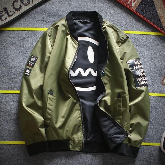 Bomber jacket with a biker motif on the back and sleeve. The inner side features a smiley face.