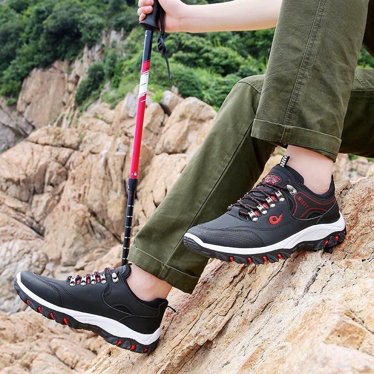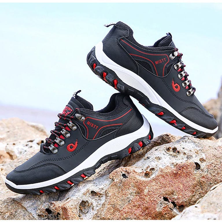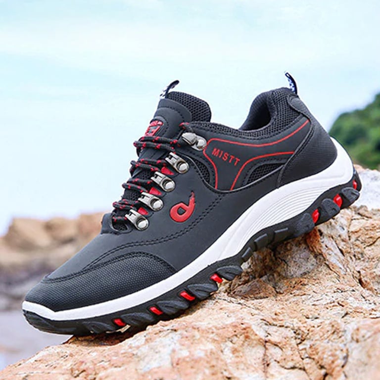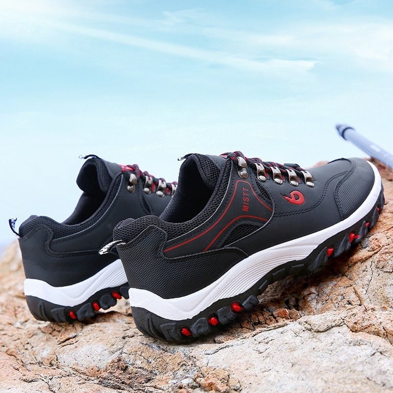 Men's outdoor shoes with lacing. Sturdy round toe. High rubber sole with tread. Waterproof surface. Available in multiple variants.