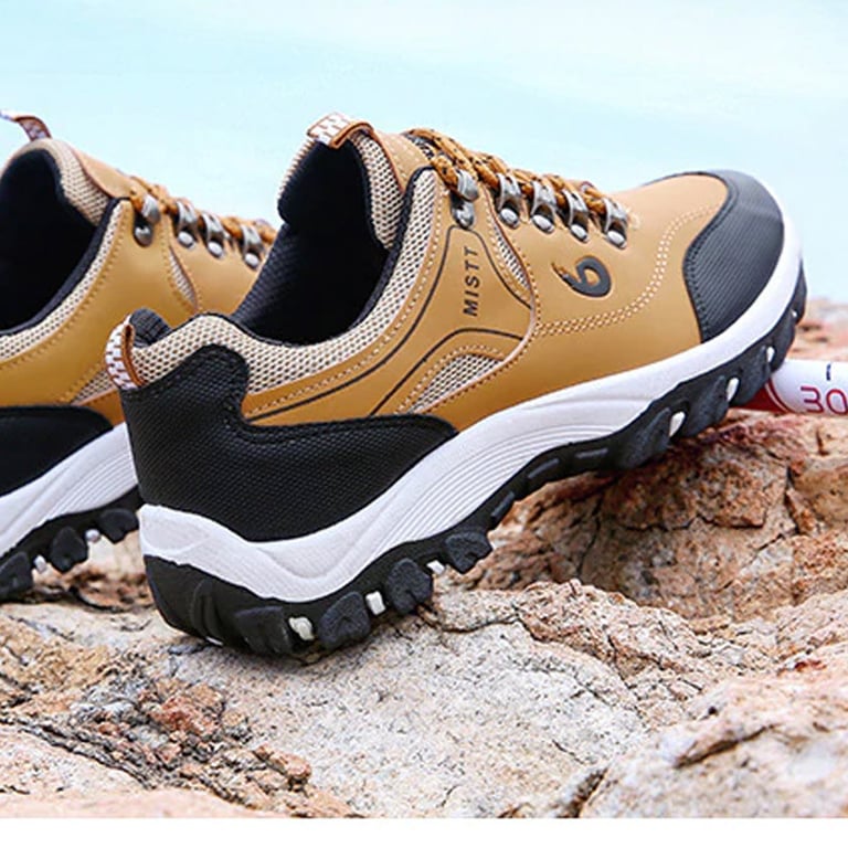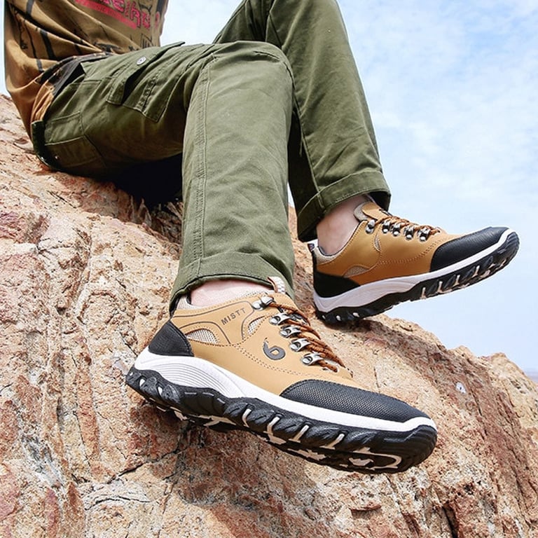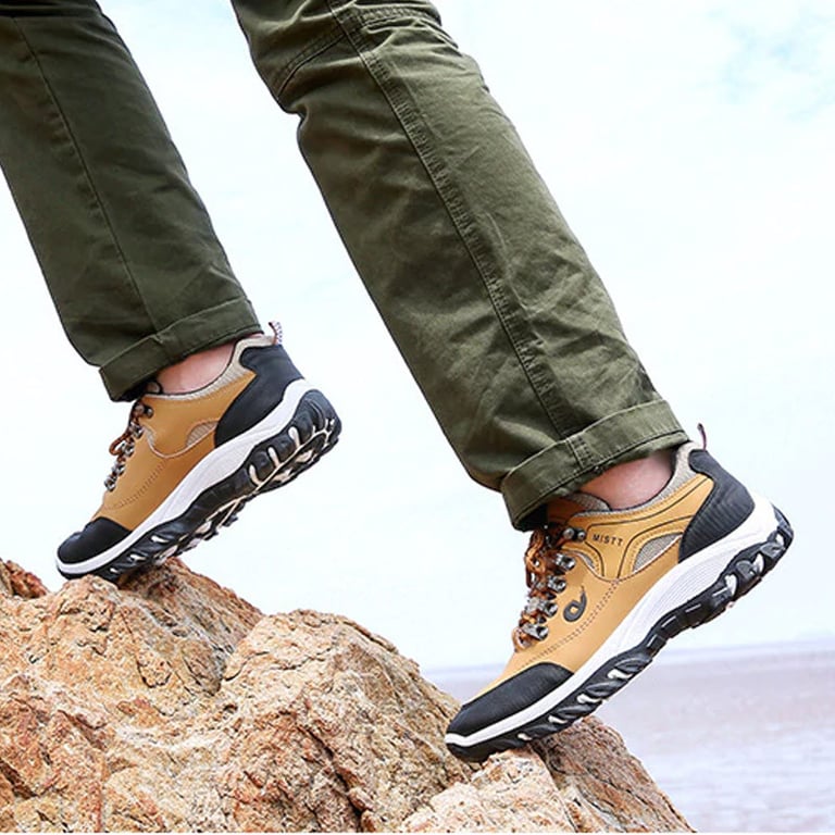 Men's outdoor shoes with lacing. Sturdy round toe. High rubber sole with tread. Waterproof surface. Available in multiple variants.