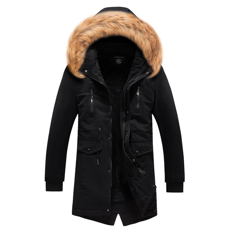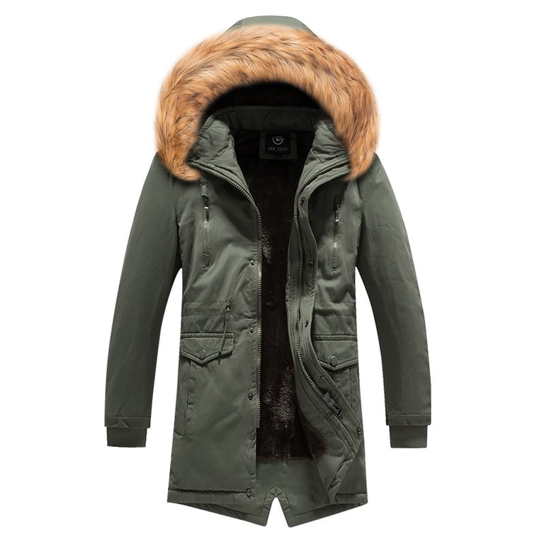 Long winter coat with a hood. The coat has two large front pockets with fastenings. It is very warm and suitable for extreme cold.