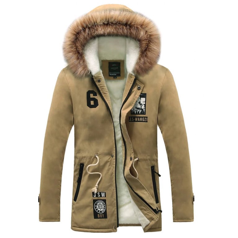 Men's long coat with a hood and faux fur. The coat features a zip fastening, two side pockets, and can be cinched at the waist with drawstrings. Available in three colours – khaki, black, and green.