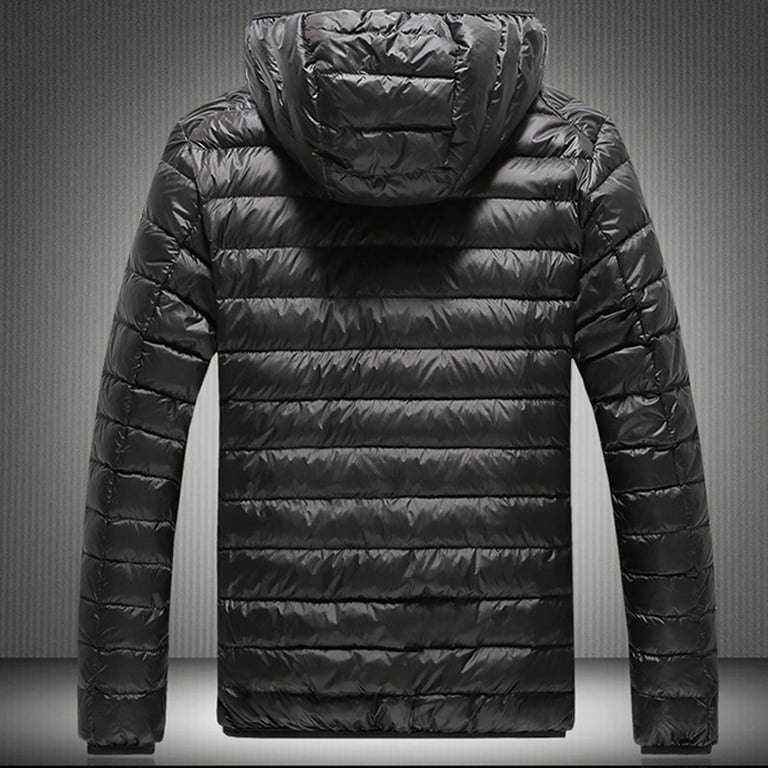 Men's transitional quilted jacket for spring/autumn. The jacket features a zip fastening and a collar with a hood. Straight cut. Shiny smooth material. Two side zip pockets. Available in several colours.