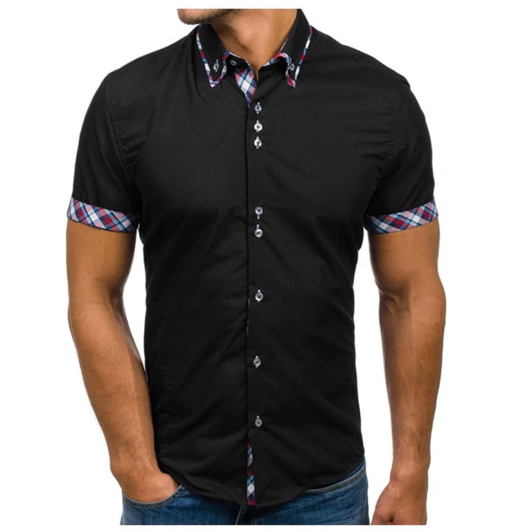 Men's casual short-sleeve shirt with a collar. Button fastening. Sleeve and collar with a checked pattern. Available in several colours.