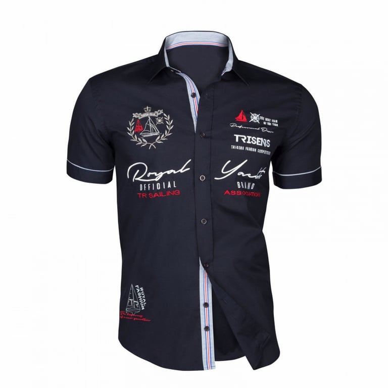 Men's short-sleeved shirt with a straight cut. The shirt features a collar with button fastening. Printed text on the front. Available in multiple colour options.