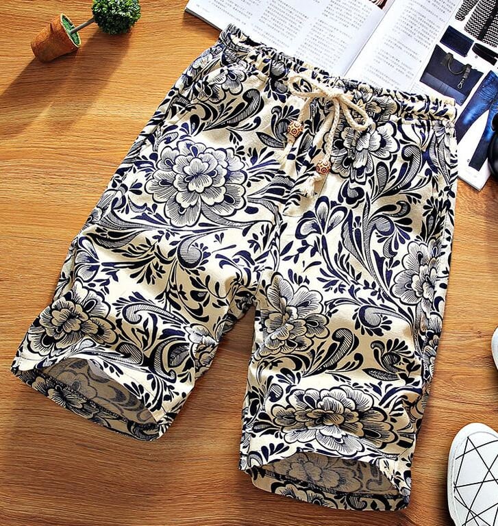 Men's shorts with a colourful pattern. The shorts feature an elastic waistband with drawstrings and two side pockets. Available in multiple colour options.