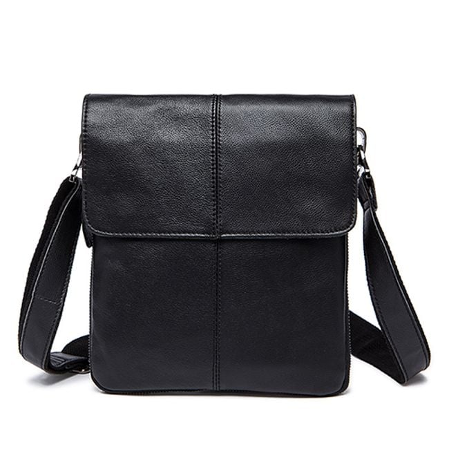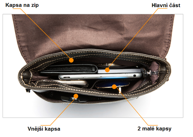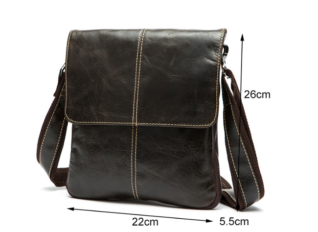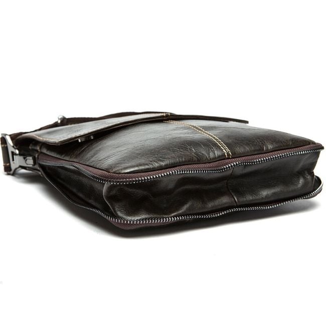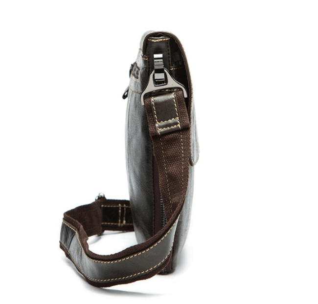 Practical men's bag made of high-quality PU leather material. The bag is worn over one shoulder and has several pockets – a main compartment, a zip pocket, one pocket at the front, two small pockets inside, and a zip pocket at the back (see images). The excellent feature of this bag is that it can be expanded in size by unzipping the zipper that runs around the entire bag. Several pleasant colours are available.