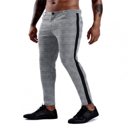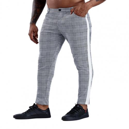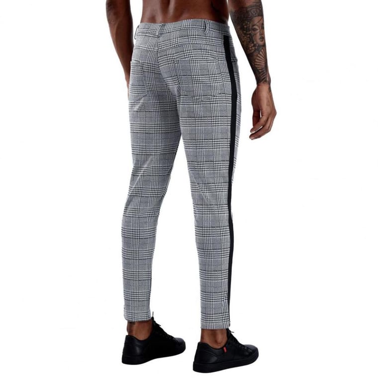 • Men's trousers featuring a modern check pattern and side stripes, in a popular slim fit.