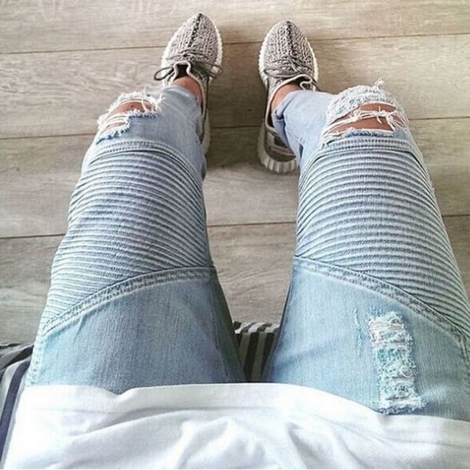 They feature stripes on the front and sides, and are slightly distressed at the front.