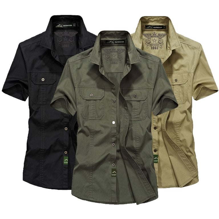 • Short sleeves, open collar, button fastening, two buttoned chest pockets.