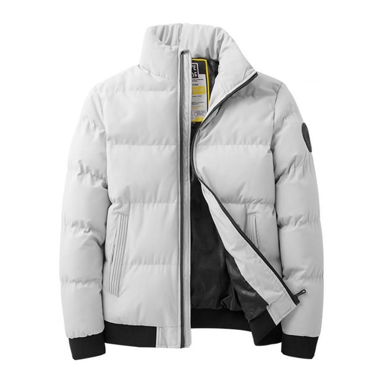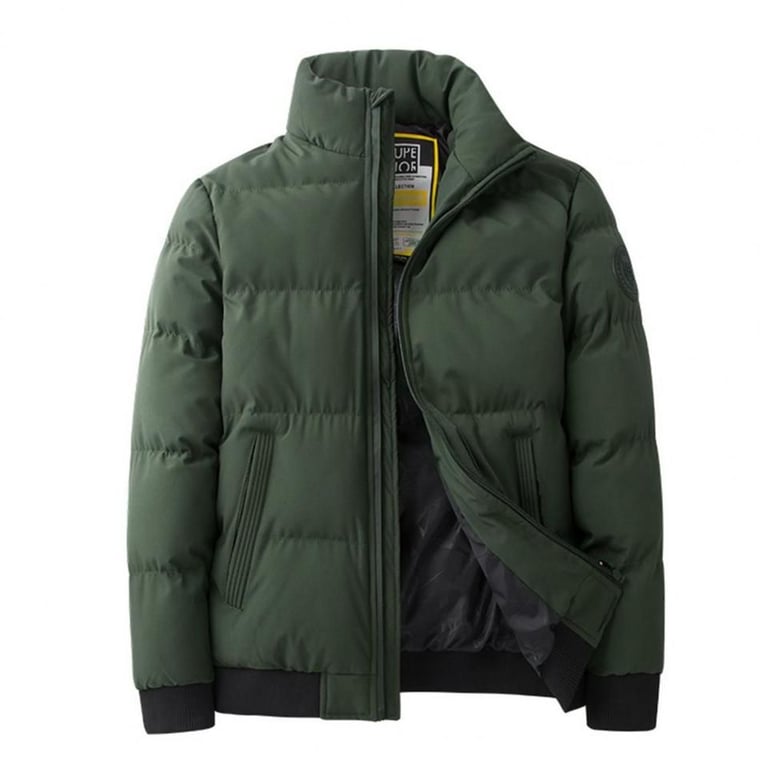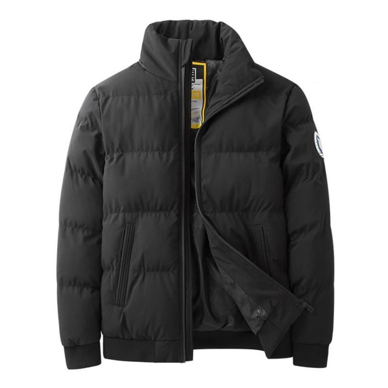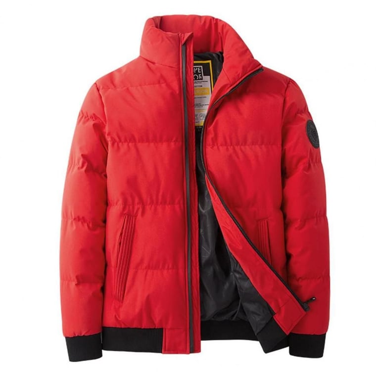 Modern men's winter down jacket with a stand-up collar.