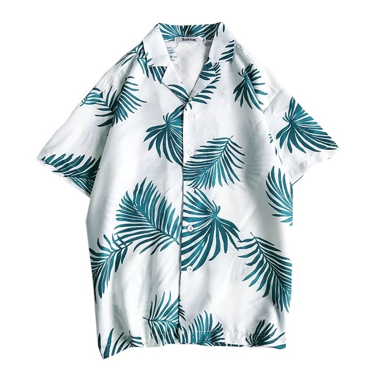 • Men's Hawaiian shirt with short sleeves, buttons on the front, and a collar.