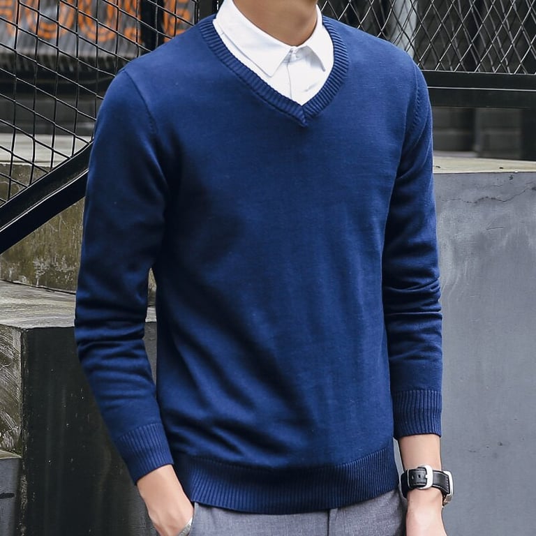 Men's sweater with a V-neck. Long sleeves. Loose fit with an elastic waistband. Solid colour. Available in multiple options.