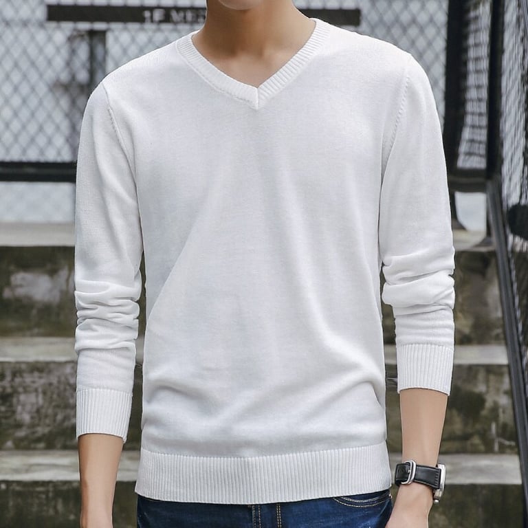 Men's sweater with a V-neck. Long sleeves. Loose fit with an elastic waistband. Solid colour. Available in multiple options.