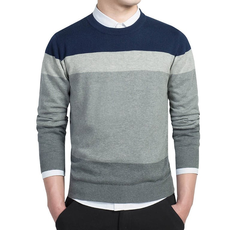 Men's sweater with a round neckline. Loose fit with an elastic waistband and long sleeves. Striped pattern. Available in multiple colour options.