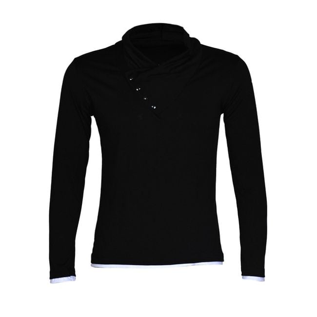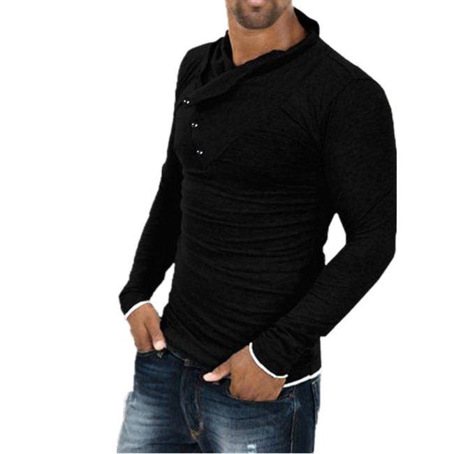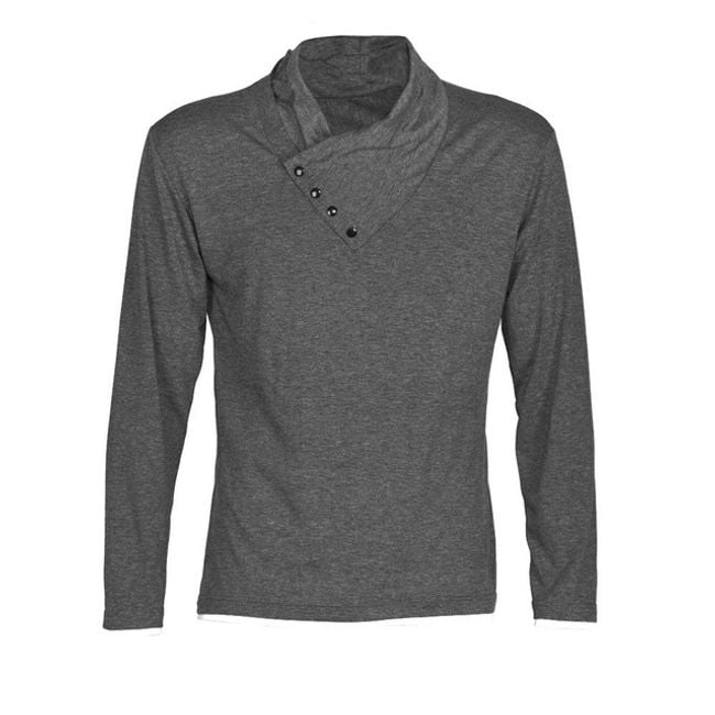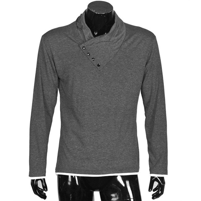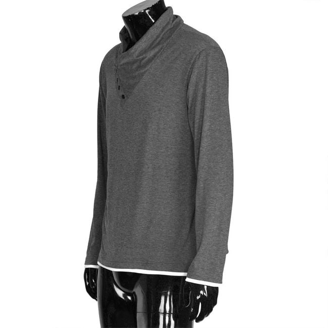 The men's sweater is interesting with its looser turtleneck. It is adorned with four small buttons.