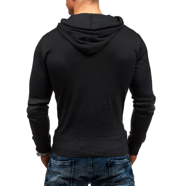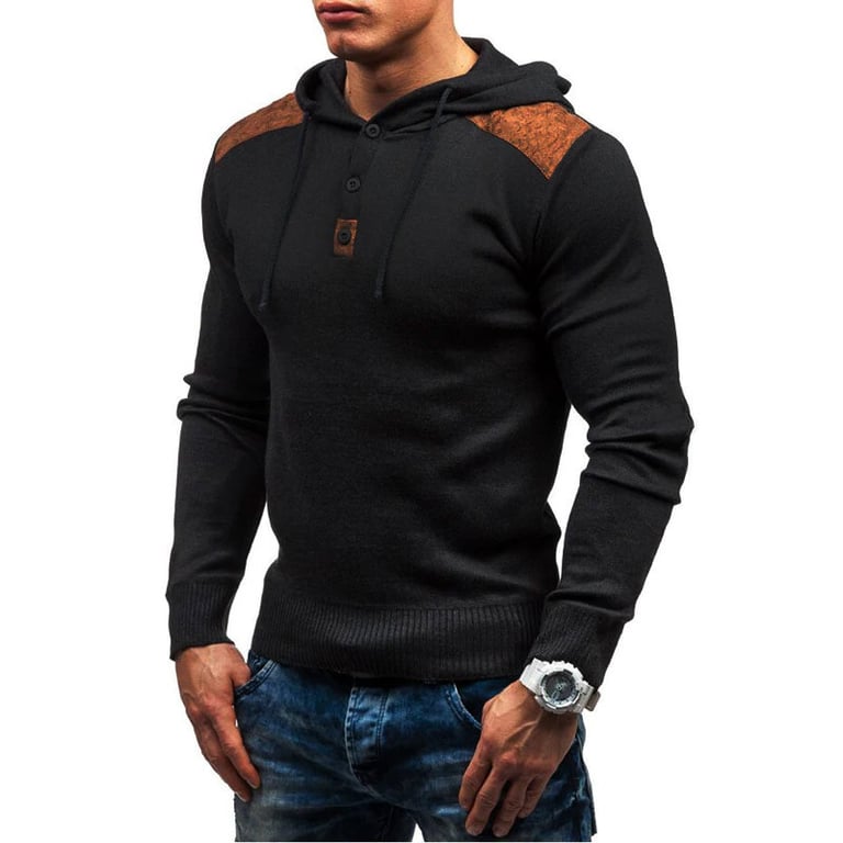 Men's pullover hoodie. Hood with drawstrings for tightening. Fastened with three buttons. Sewn patches on the shoulders. Available in two colours.