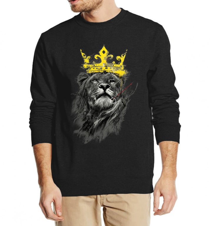 Men's basic pullover sweatshirt. The sweatshirt has a loose fit with an elastic waistband, long sleeves, and a round neckline. Solid colour with a print on the front.