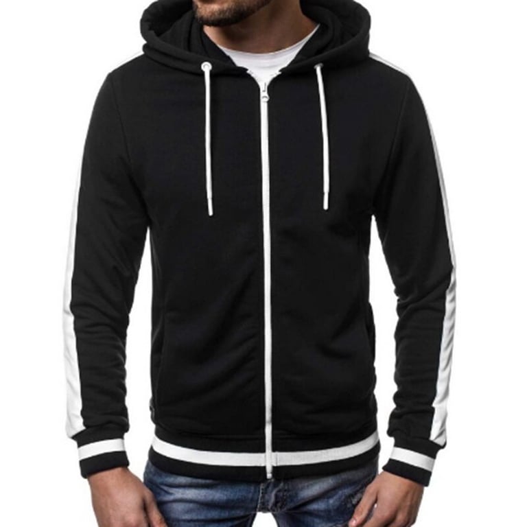 Men's hoodie with a zip fastening and hood. Stripe decoration. Elastic waistband. Two side pockets. Available in multiple colour options.