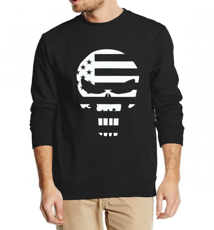 Men's basic pullover sweatshirt. The sweatshirt has a loose fit with an elastic waistband, long sleeves, and a round neckline. It is solid-coloured with a print on the front.