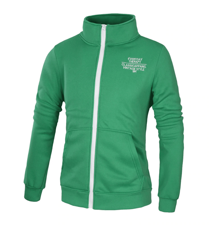 Men's sweatshirt with a stand-up collar, no hood, zip fastening, and a print on the chest. Available in four colour options.