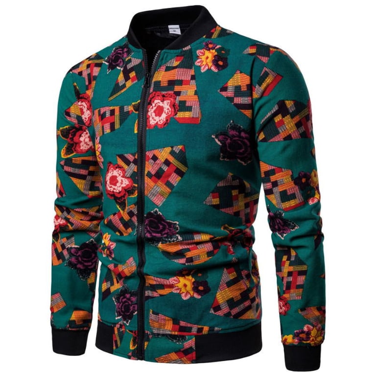 Men's zip-up sweatshirt without a hood and with a collar. The sweatshirt features a zip fastening and an elastic waistband. Made from a pleasant lightweight material. Colourful pattern. Available in several variants.