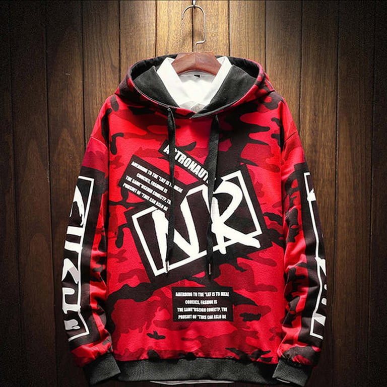 Men's loose-fitting hoodie with a hood and drawstrings. Printed with an army motif and text. Available in two colour variants.