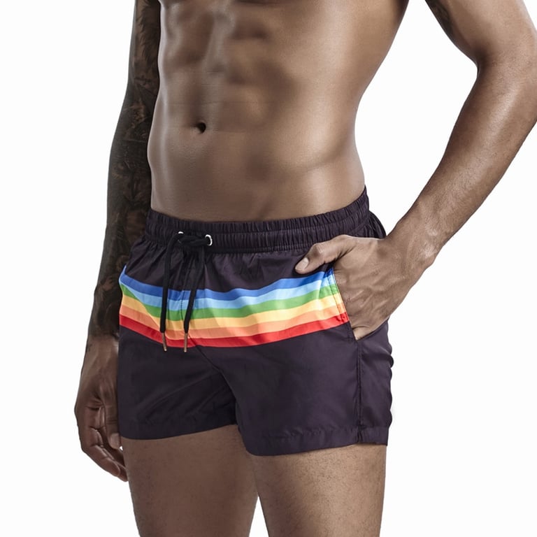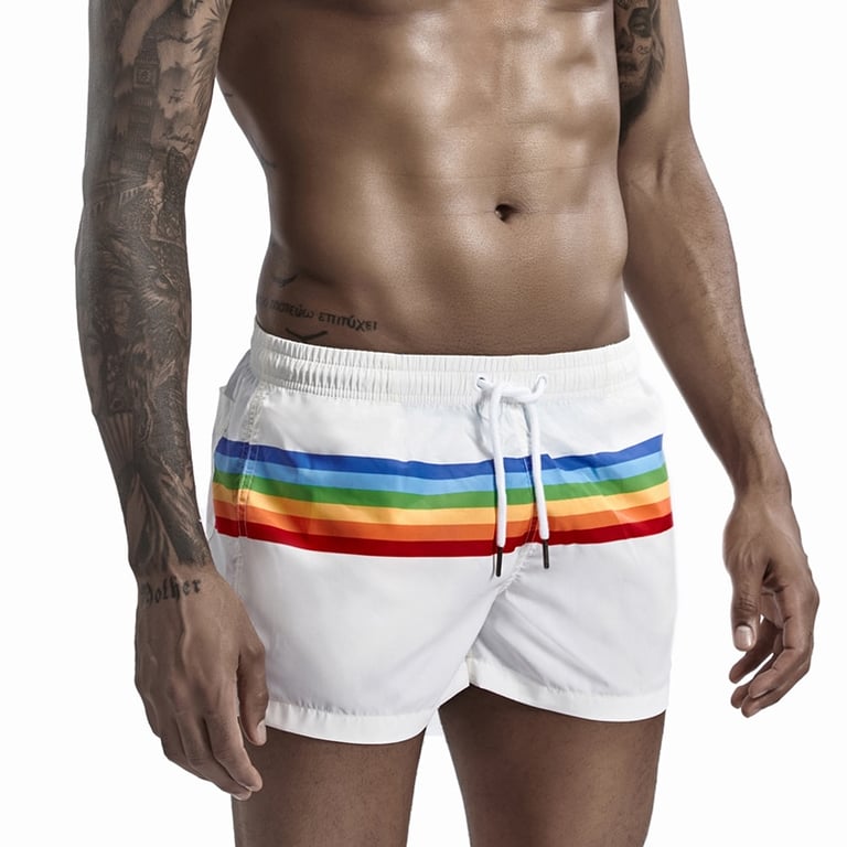Men's swimming shorts with a rainbow.