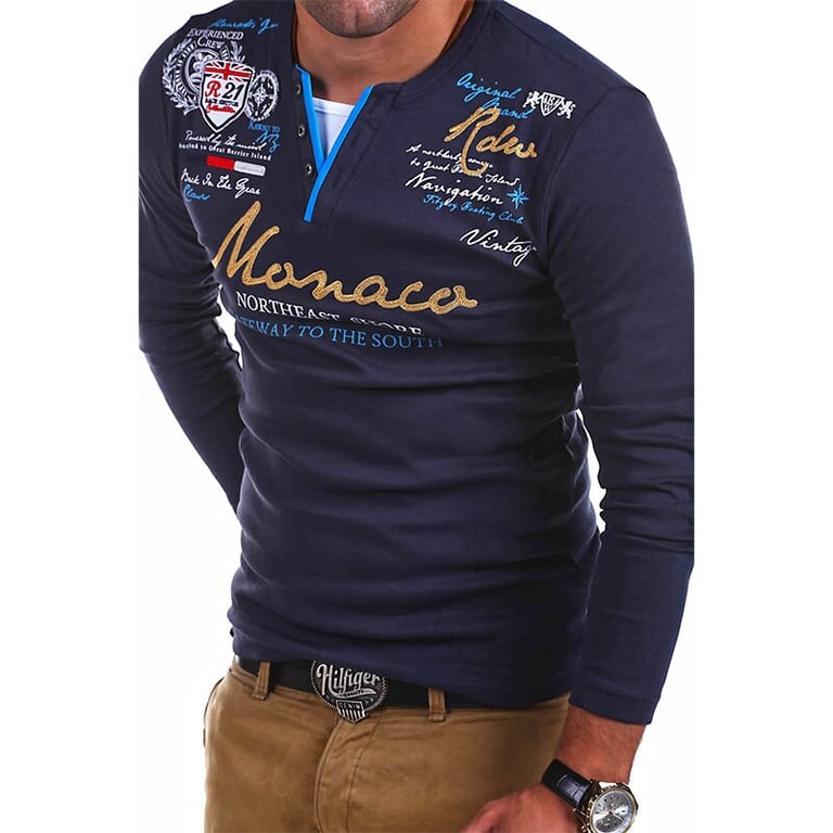 Men's long-sleeve t-shirt. The t-shirt has a fitted cut and a buttoned neckline. Print with lettering on the front. Available in multiple colour variants.