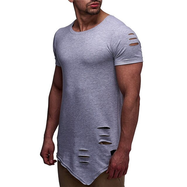 Men's short-sleeved t-shirt with a round neckline. Longer asymmetric cut with decorative perforations. Available in multiple colour options.