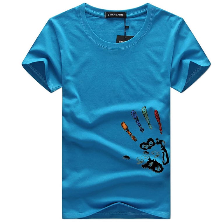 Men's loose-fitting t-shirt with short sleeves and a round neckline. It features a colourful hand print on the front. Available in multiple colour options.