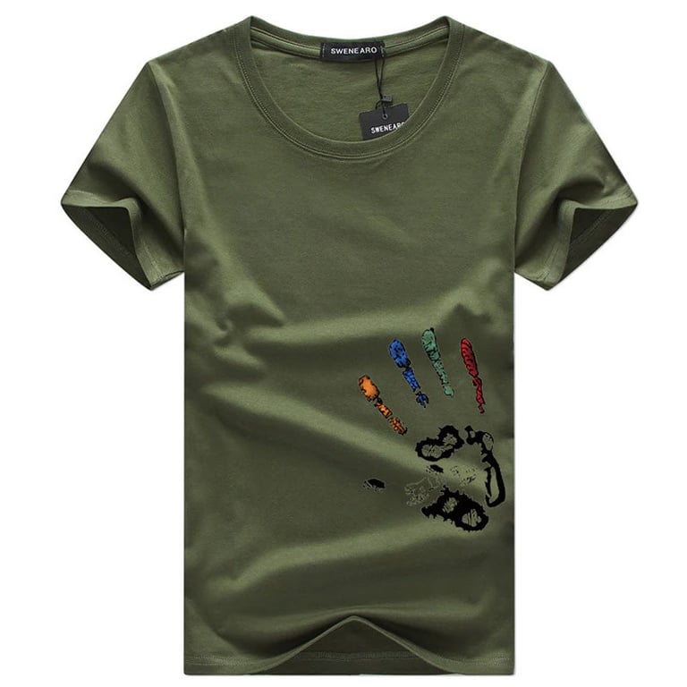 Men's loose-fitting t-shirt with short sleeves and a round neckline. It features a colourful hand print on the front. Available in multiple colour options.