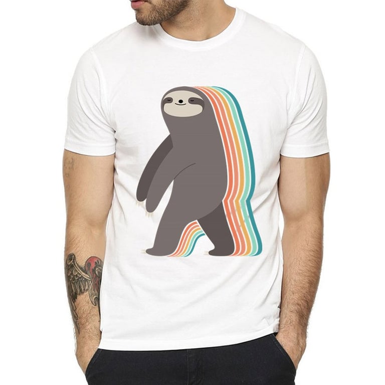 Men's short-sleeved t-shirt with a round neckline. Solid white. The t-shirt features an original colourful print with a sloth.