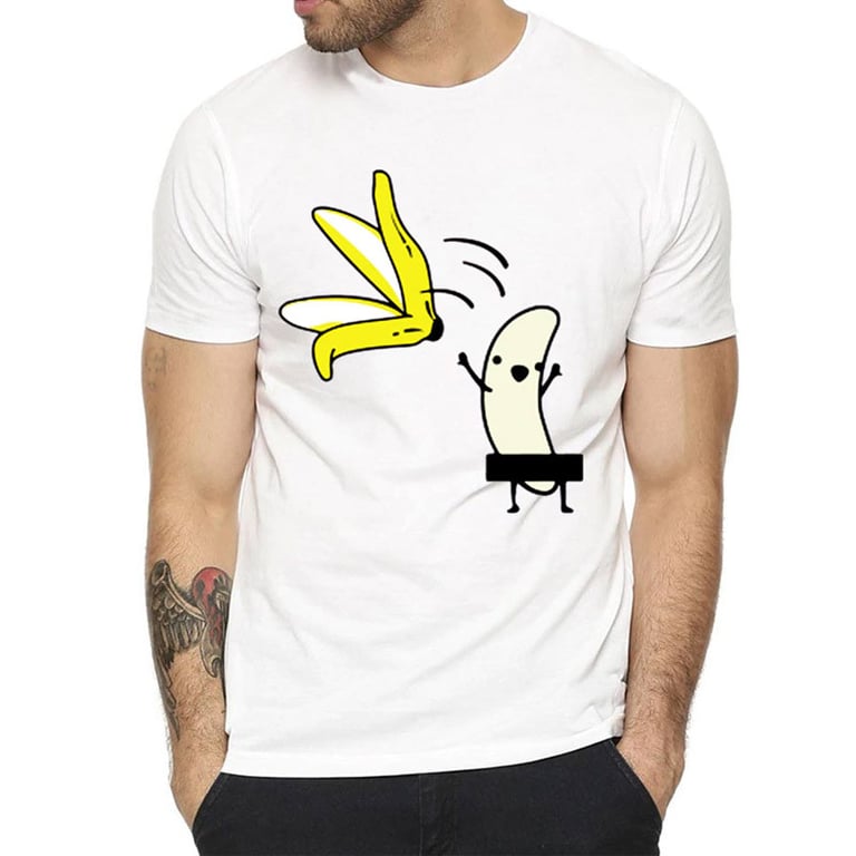 Men's short-sleeved t-shirt with a round neckline. Solid colour. The t-shirt features an original funny print with a banana.