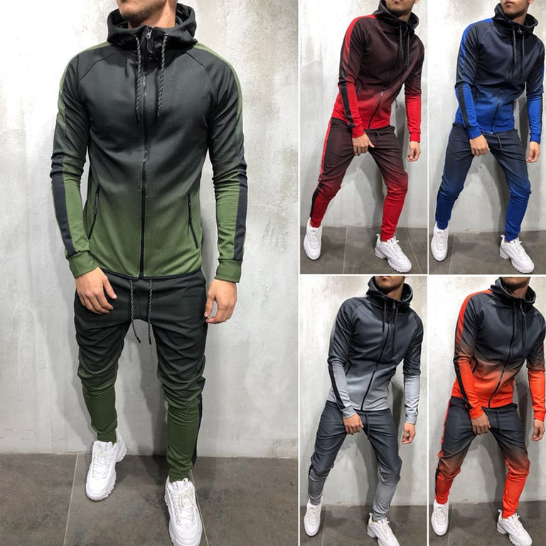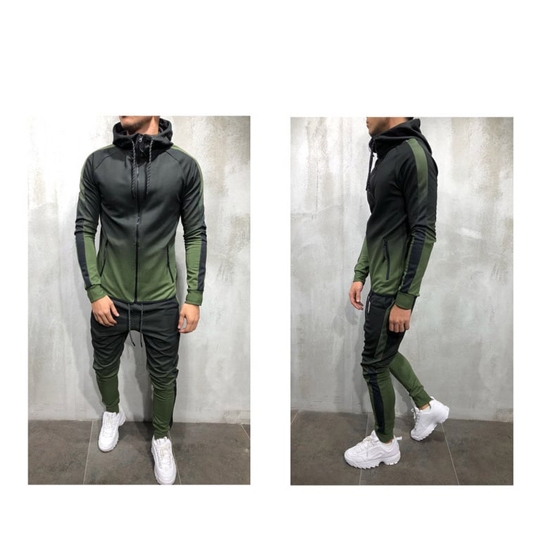 Men's sports tracksuit. Hoodie with a zip fastening. Two side zip pockets. Joggers with an elasticated waist and drawstring. Available in several colours.