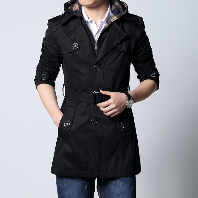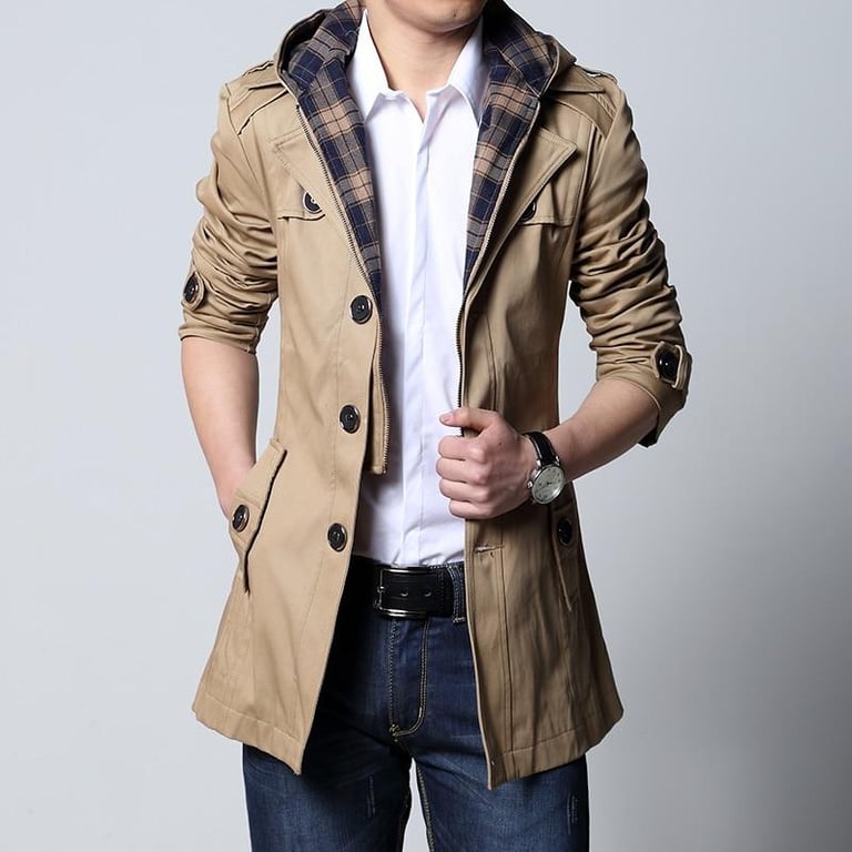 Stylish, medium-length men's trench coat with a hood. Front fastening with three buttons and an inner pattern.