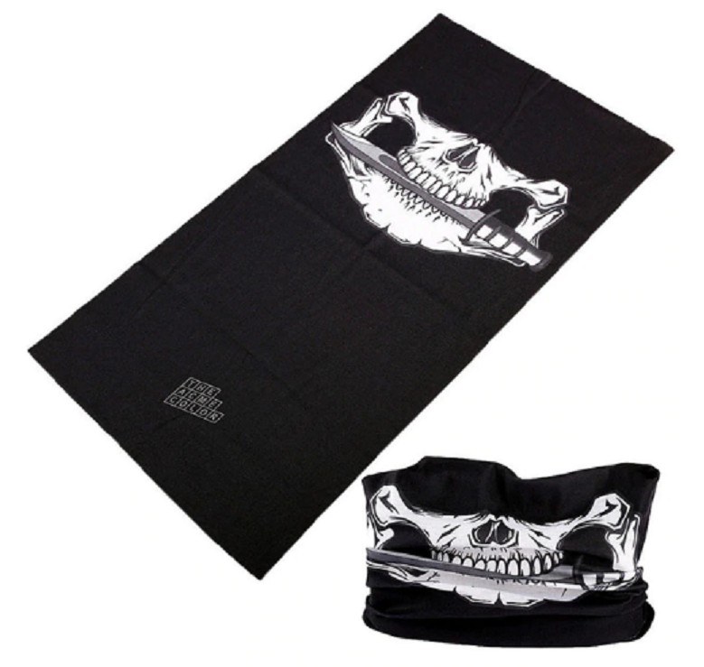 A stylish men's neck gaiter featuring a skull with a knife in its bite will command the respect it deserves. Order now at a fantastic price and become the terror of your surroundings! Material: polyester