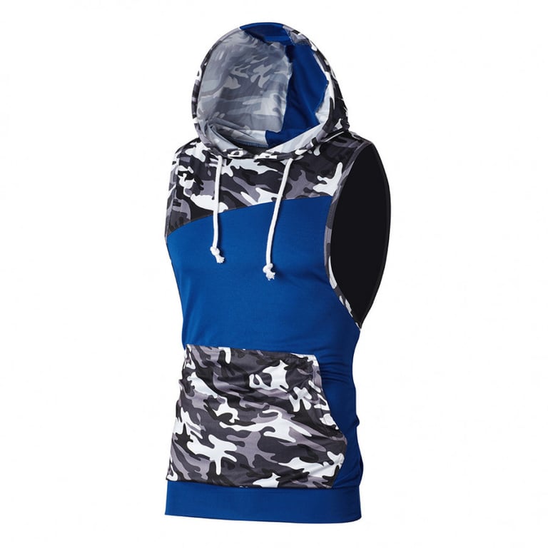 Men's vest with a hood and drawstrings. Fitted cut with a kangaroo pocket. Printed with an army pattern. Available in multiple colour options.
