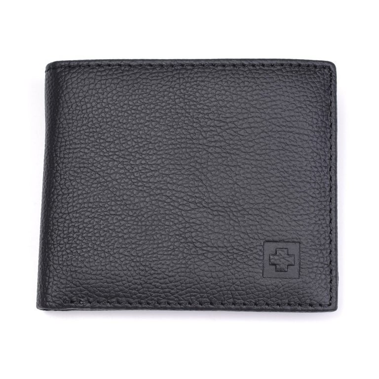 Men's wallet with a leather-like appearance. Metal logo. Elegant look. Card slots, banknote compartment, internal pockets, coin pocket with zip closure. Available in three colours.