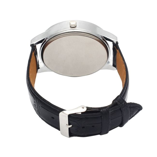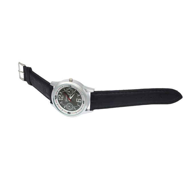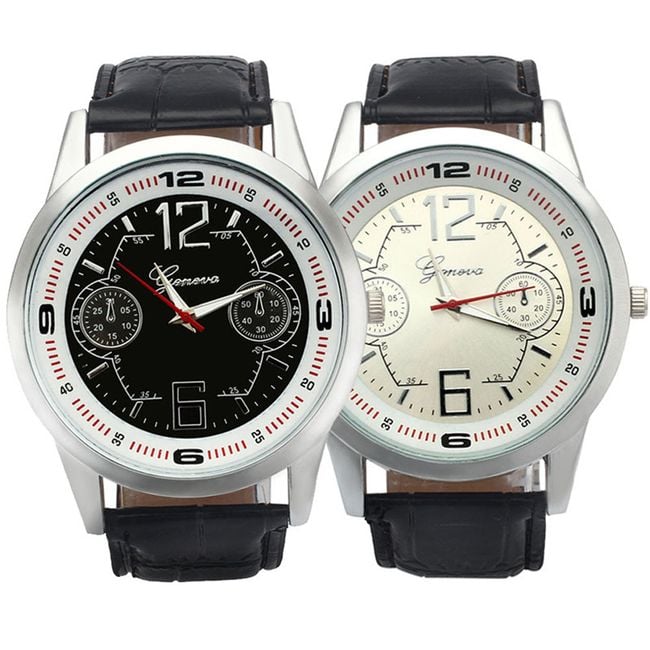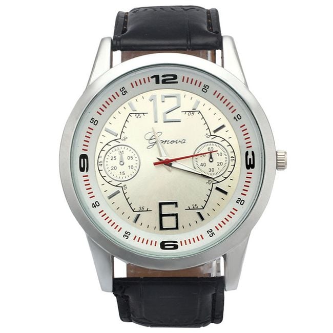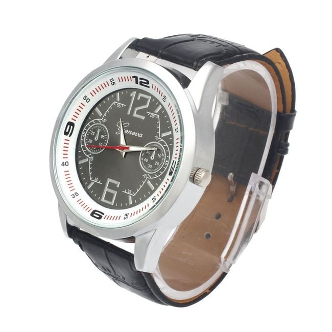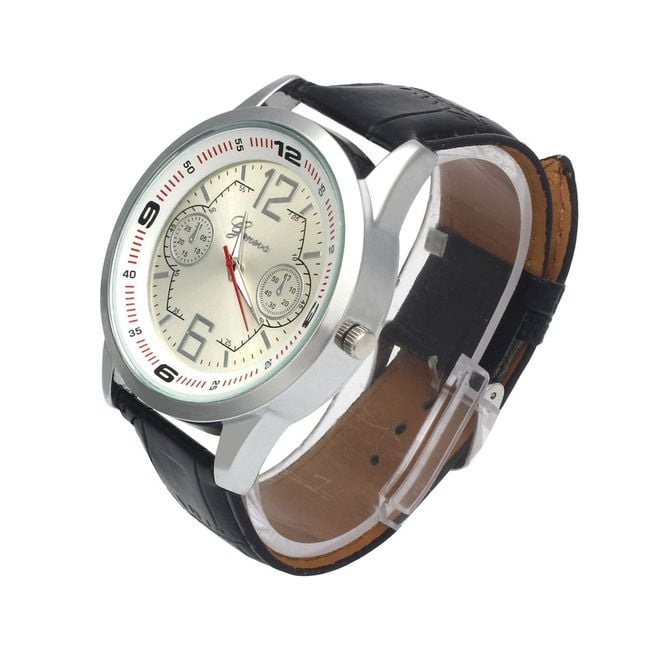 Men's watch with a faux leather strap features a very sophisticated dial. Available in two colours. Option to order a box.